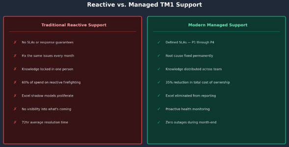 The root cause of all four problems is the same: the operating model is reactive, knowledge is trapped, and improvements never get prioritised. In short, TM1 is not the problem. Support is.