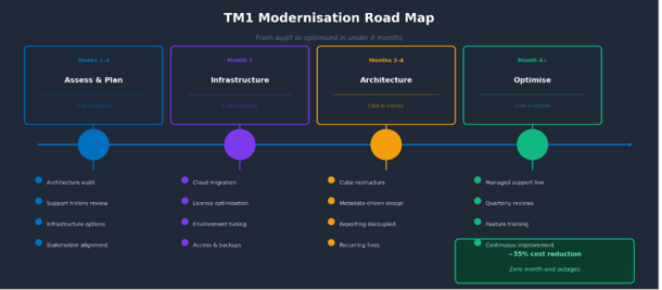 A complex multi-entity TM1 environment with a heavy reporting load, mid-way through a cloud migration. By moving from a reactive break-fix model to a governed, predictable support structure with defined SLAs, this client eliminated their top five recurring issues within 90 days, reduced ticket volume by 40%, and completed their cloud migration with zero disruption to BAU operations including through a live budget cycle.