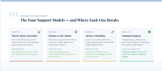 The root cause of all four problems is the same: the operating model is reactive, knowledge is trapped, and improvements never get prioritised. In short, TM1 is not the problem. Support is.