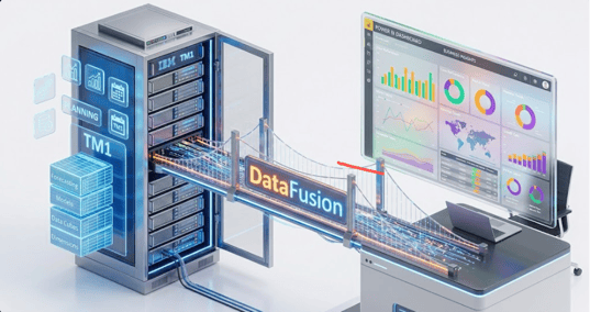 [PROMPT FOR NANO BANANA PRO: 3D isometric flow diagram. Left: modular data source icons (ERP/CRM). Center: a glowing, sophisticated central "TM1 Engine" cube. Right: a modern, sleek "DataFusion" bridge connecting to a cluster of beautiful,